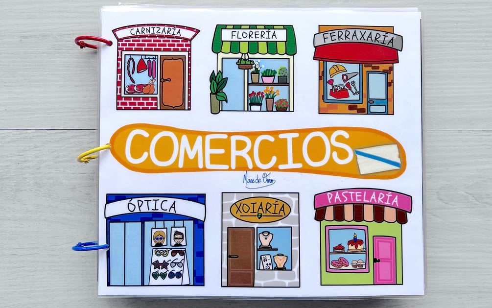 En este material puedes encontrar 28 comercios con sus respectivas ventanas encajables para relacionar el nombre con el producto de ese comercio.