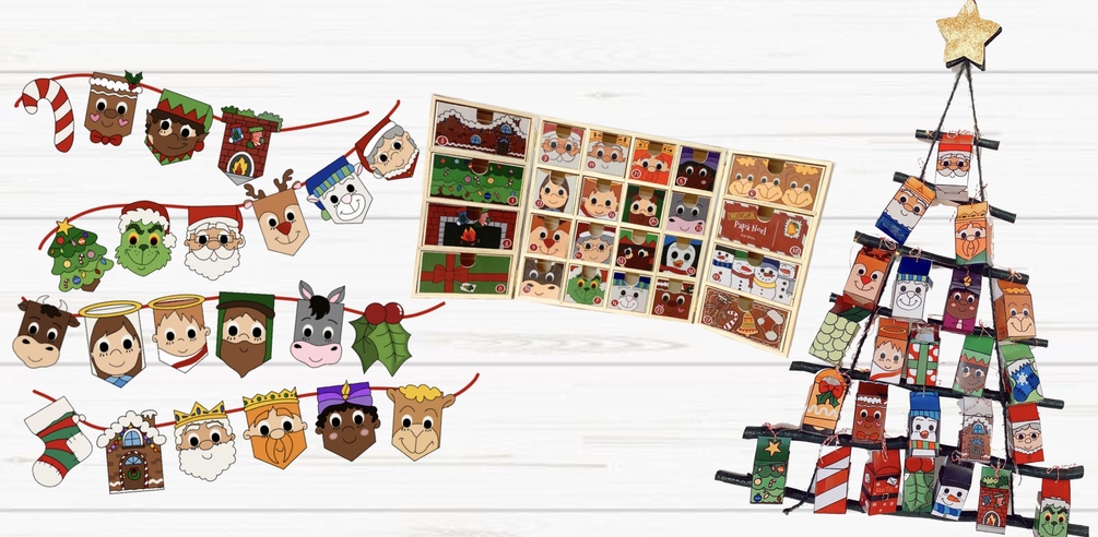 - Por último, puedes encontrar un documento con diferentes plantillas para forrar esta caja de madera de adviento. Las imágenes se ajustan al tamaño de esta en particular dejando unos márgenes de 1 cm. Muchas partes debes ajustarlas recortando sobrante o en el lugar de las bisagras ya que no todas las cajas lo tienen en ese centímetro exacto de medida.
