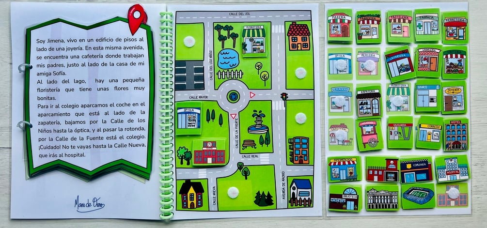Tras el material de Comercios y Servicios, se me ocurrió fusionarlos y hablar de la ciudad y su orientación. Derecha, izquierda, subir, bajar, calles, rotondas, avenidas...